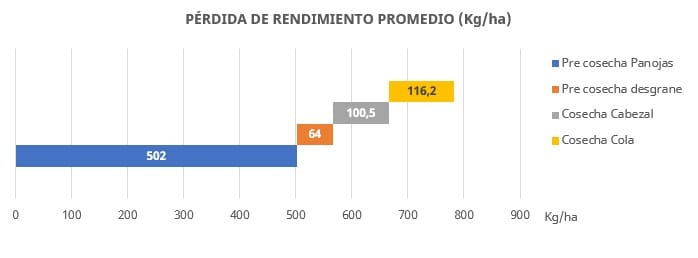 Como resultado, se obtuvo un valor promedio de pérdidas totales de 783 kg/ha (ilustración 3), representado en 566 kg/ha de pérdidas en precosecha y 216,6 kg/ha durante la cosecha.