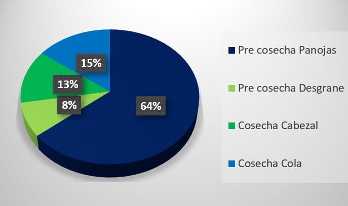 - Criterios durante la cosecha: Las pérdidas durante la cosecha se componen de perdidas por cola (panojas mal trilladas y granos sueltos) y por cabezal de la máquina (desgrane y panojas sueltas).