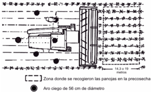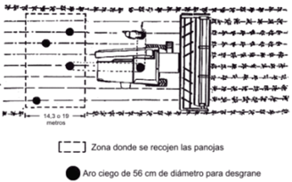 - Por desgrane: Utilizando un aro de 56 cm de diámetro y marcando cuatro lugares representativos, se recolectaron los granos presentes en el suelo.