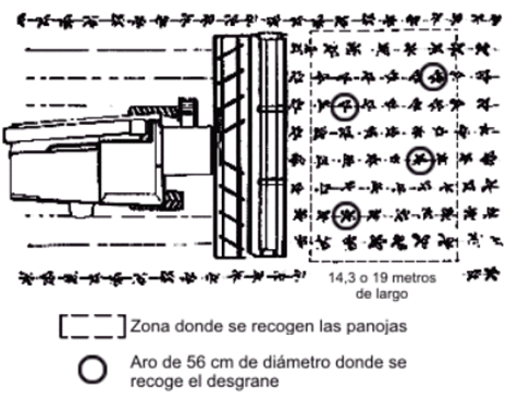 Debajo de los aros ciegos arrojados para calcular las pérdidas por cola, recolectar todos los granos. A este valor se le debe restar el valor de pérdidas por desgrane en la precosecha, para así obtener el valor de pérdidas por desgrane del cabezal.
