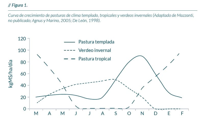 En ese sentido si nos vamos al NOA o NEA Argentino tendremos entre noviembre y mayo, de la mano de especies tropicales (Figura 1), una oferta de recursos para pastoreo que nos resuelve gran parte de las necesidades forrajeras; siendo el cuello de botella el invierno con nula productividad y/o baja calidad de recursos.