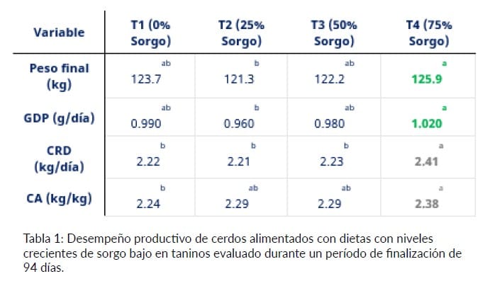 Históricamente, el sorgo tuvo una participación limitada en la nutrición porcina debida a la presencia de taninos condensados, compuestos que reducen la digestibilidad de las proteínas y afectan la palatabilidad. Estos efectos se traducirían en menores tasas de crecimiento y eficiencia de conversión.