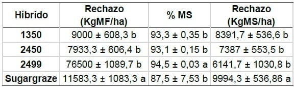 KgMS/Ha). - Rechazo luego del pastoreo (KgMF/Ha y KgMS/Ha).