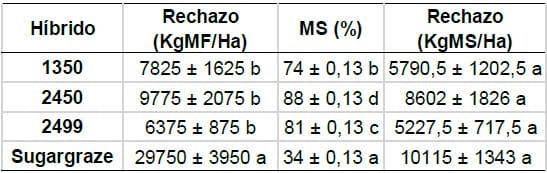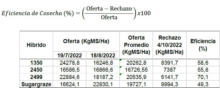 En la determinación final (lote completo) de eficiencia de pastoreo se utilizó el promedio de producción de oferta forrajera correspondientes a las mediciones de las fechas 19/7/2022, y 18/8/2022. En la estimación del rechazo, se hicieron 3 muestreos al azar de 1 m2 para cada híbrido después de que se retiraron todos los animales. El cálculo eficiencia de cosecha se realizó en base a la siguiente fórmula: