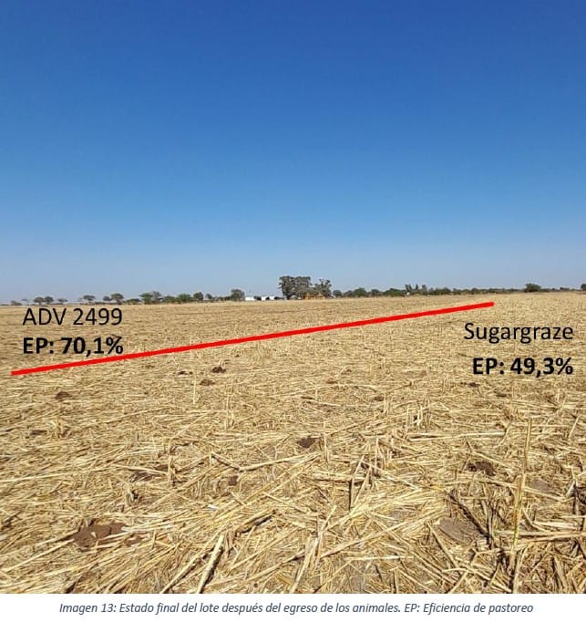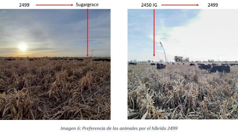 Los híbridos se evaluaron con animales Aberdeen Angus de la cabaña de dicha institución. Los materiales genéticos fueron ADV 1350, ADV 2450, ADV 2499 y Sugargraze. Todos los híbridos fueron curados con concep y pulverizados con S-metalaclor para el control de malezas. La superficie destinada fue de 9,45 Has dividida en 4 franjas 60 m de ancho a excepción de sugargraze que tuvo un ancho de 50 m de ancho y 360 m de largo. Las cabeceras de siembra se hicieron con sugargraze (20 m al este y 20 m al oeste). Todas las franjas de siembra se dividieron en 8 parcelas de 1,15 Ha armadas de forma perpendicular a la siembra para que en cada una, se encontraran los 4 híbridos.