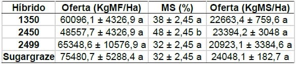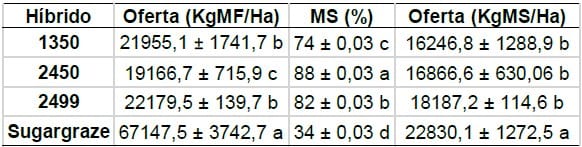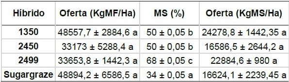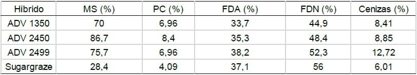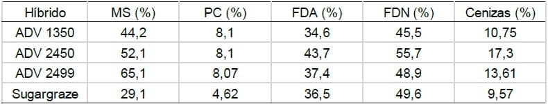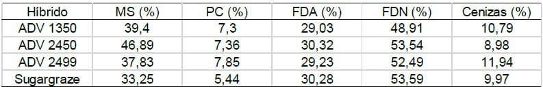 La superficie destinada a cada híbrido fue: 2,16 Has para ADV 1350, ADV 2450, ADV 2499 y 1,8 Has Sugargraze.