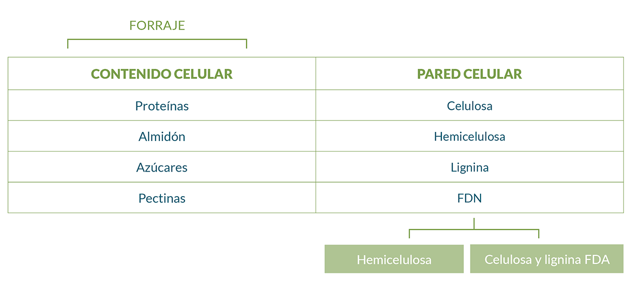 Es importante tener en cuenta que el principal componente del tallo es la pared celular que se cuantifica mediante el valor de FDN (fibra detergente neutra) y que puede estar en proporciones que van entre el 50% y 75% del tallo, el resto es contenido celular que está en menor proporción.
