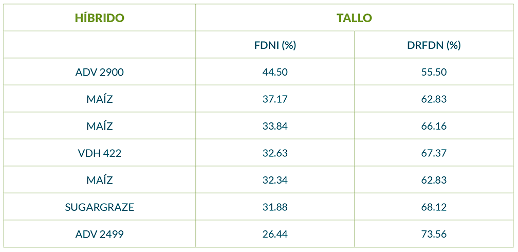 En la Tabla 1 se detallan los resultados de mediciones realizadas en el INTA Manfredi en los que se determinó la FDNi de distintos híbridos de sorgo y maíz en el momento de confección de silajes, mediante la incubación de muestras dentro del rumen de bovinos fistulados (técnica “in situ”).