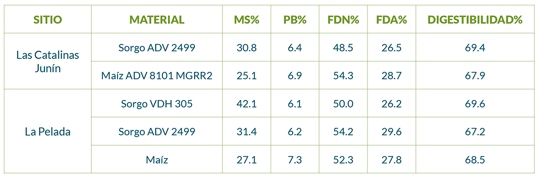 Otras mediciones llevadas a cabo por el INTA Manfredi validan el uso de materiales BMR de sorgo para lograr altos valores de digestibilidad en silos de planta entera, mostrando valores superiores a los de maíz. En la tabla 2, se detallan algunos resultados comparativos de calidad en maíz y sorgo con muestras tomadas en campos de productores durante la campaña 2014-15.