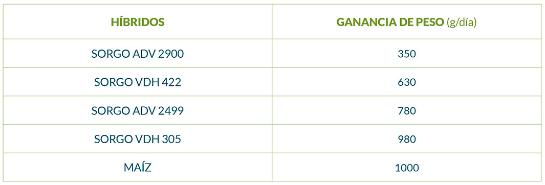 Estas diferencias se corresponden luego con la respuesta animal durante la alimentación con silajes, que con sorgos puede variar entre 300gr/día y algo más de 1 kg de ganancia de peso/día según datos obtenidos en INTA Manfredi. Algunos resultados comparativos se presentan en la Tabla 3.