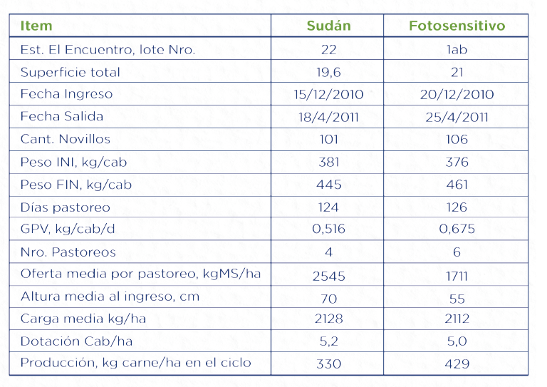 Anteriormente, se realizaron evaluaciones en el mismo establecimiento en las que se comparó la producción de carne lograda con novillos en terminación durante el verano sobre sorgos Sudán (imagen 1) y Fotosensitivo (imagen 2), muestran un diferencial en ganancia de peso y un mayor número de pastoreos a favor del biotipo Fotosensitivo (tabla 2).