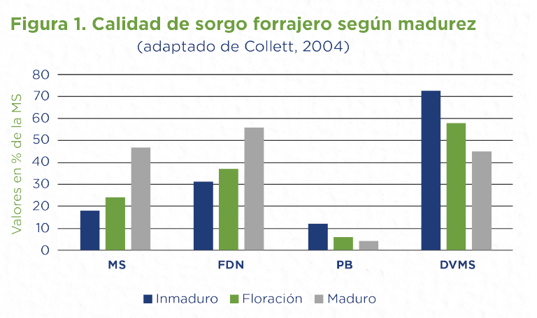 La figura 1. describe como en estados inmaduros (barra celeste) encontramos baja proporción de materia seca (MS), baja fibra, alto contenido proteico y alta digestibilidad; y en la medida que avanzamos en madurez, sube la fibra, bajan compuestos solubles y por ende baja la digestibilidad en sorgo forrajeros (en graníferos eso puede compensarse con el almidón que se acumula en grano).