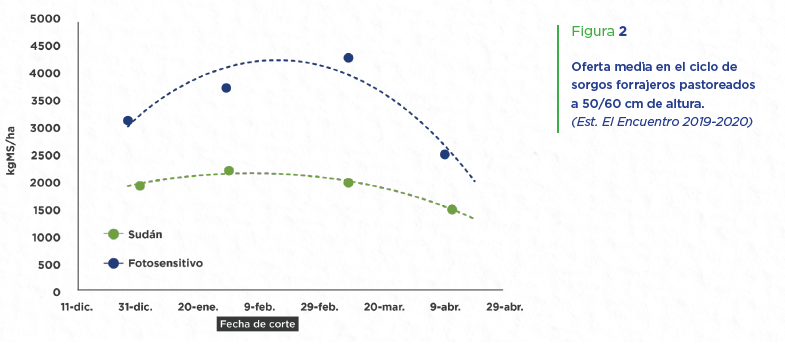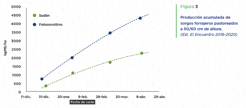 Evaluaciones recientes realizadas en el Est. “El Encuentro”, comparando sorgos forrajeros sembrados 20/11/19, pastoreados cuando cada biotipo alcanzo los 50/60cm de altura, muestran que los materiales Fotosensitivos superaron ampliamente a los sorgos Sudán en cuanto a tasas de crecimiento (101 vs 57 kgMS/ha/día, respectivamente), generando no sólo más kgMS/ha disponible en cada uno de los 4 pastoreos realizados, sino, también, más kgMS/ha de producción total (Figuras 2 y 3).