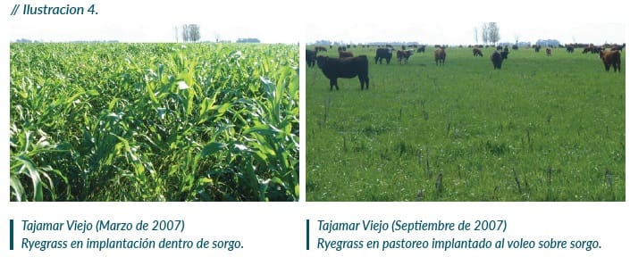 Experiencias realizadas en el Est. El Encuentro en los últimos 10 años, en donde la rotación sorgo/ryegrass conviven en un sistema de cría bovina intensiva, han demostrado que tanto la productividad de los sorgos como de ryegrass, no difieren en lo absoluto de las siembras tradicionales en las que el proceso se inicia con un control químico del antecesor. A favor de la intersiembra de ryegrass sobre sorgo, tenemos la ventaja de estar realizando una siembra temprana, que como sabemos es determinante no sólo para el aprovechamiento temprano, sino también para maximizar la productividad del ryegrass (Brizuela, 2000).