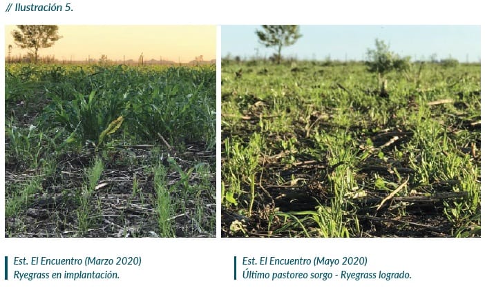 Esto no es necesario si utilizamos sembradora, ya que la distribución y contacto con el suelo es muy uniforme, y ello garantiza el logro del verdeo de inverno una vez que el último pastoreo seguido de una helada, se encarguen del sorgo (ilustración 5).