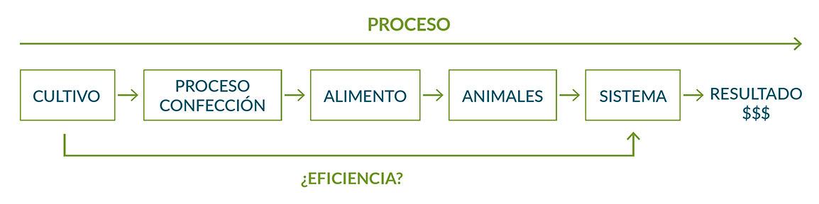 En la figura 1 se presenta el esquema conceptual del proceso de transformación desde el cultivo, atravesando los principales eslabones de la cadena hacia la producción y suministro de alimento (silo) hasta alcanzar el producto final.