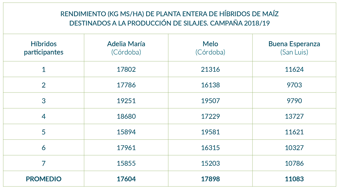 Tabla 1. Rendimientos (kg MS/ha) de híbridos de maíz para silajes en distintas localidades.