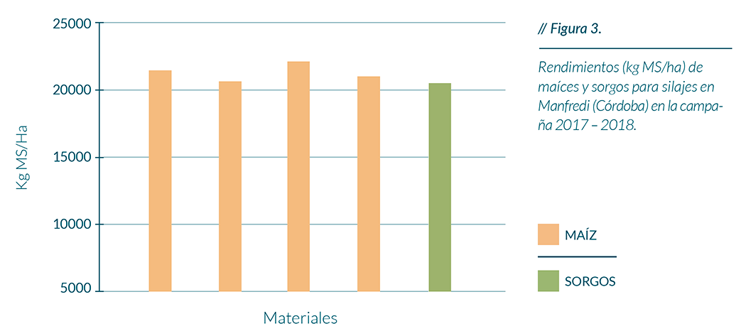 Uno de los aspectos claves para mejorar el resultado económico de la transformación del cultivo en carne (por cantidad de alimento disponible y por costo del kg de alimento), es la de alcanzar los potenciales productivos del híbrido utilizado. En este aspecto, en la figura 3 se presentan los rendimientos comparativos de maíces y sorgos en la campaña 2017/18 que muestran niveles de rendimiento promedio de 20.000 kg de MS/ha.