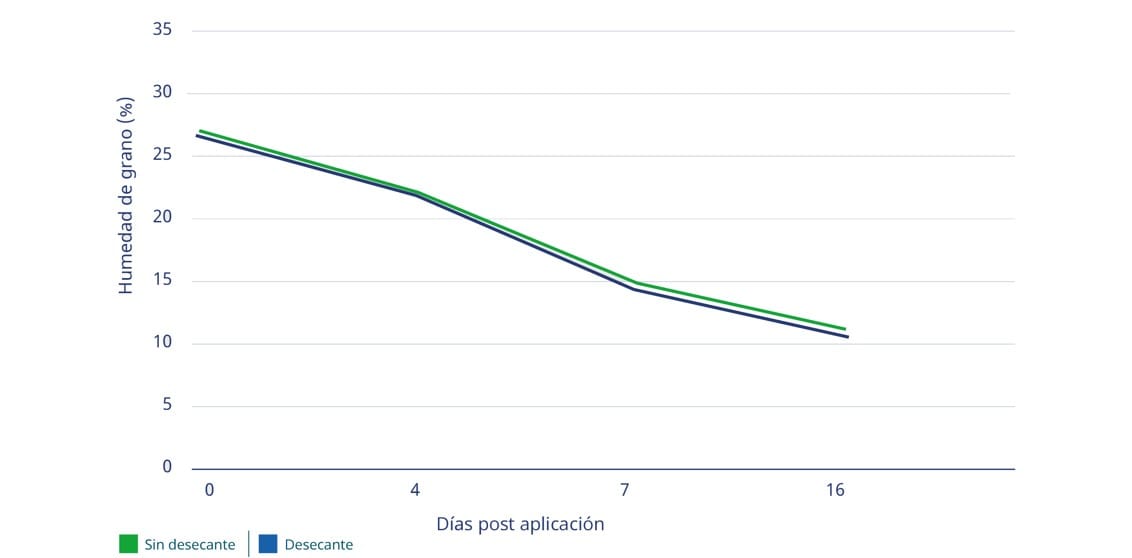 Sin embargo, en esta etapa, el grano puede aún tener porcentajes de humedad de hasta el 50%. Como los desecantes tienen poco impacto en la humedad del grano (Figuras 2 y 3), deben aplicarse en función de la madurez fisiológica del cultivo y la humedad del grano cercano a cosecha.